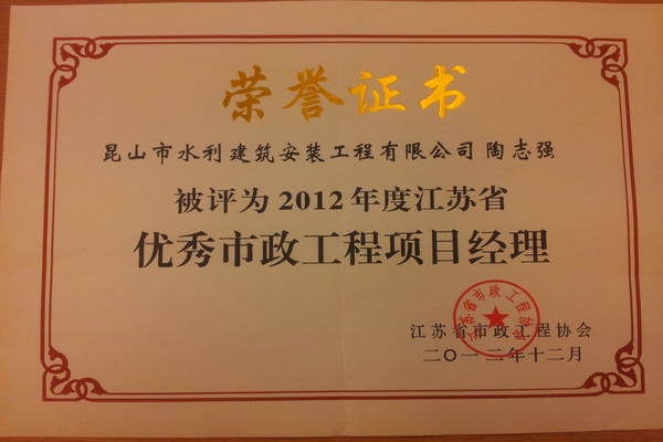 我公司項目經(jīng)理陶志強被評為2012年度江蘇省優(yōu)秀市政工程項目經(jīng)理。