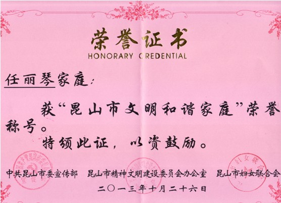 在10月份開(kāi)展的昆山市“平安家庭”創(chuàng )建活動(dòng)中,我公司任麗琴家庭喜獲“昆山市文明和諧家庭”榮譽(yù)稱(chēng)號。