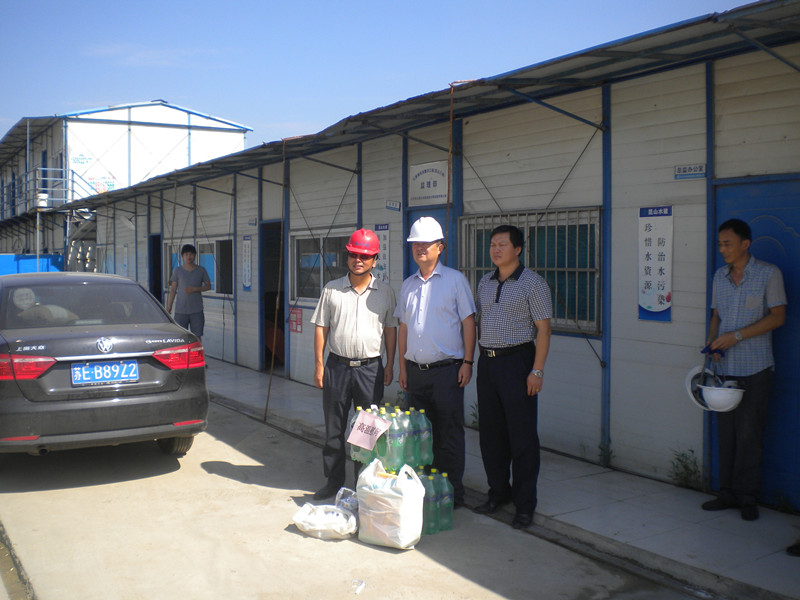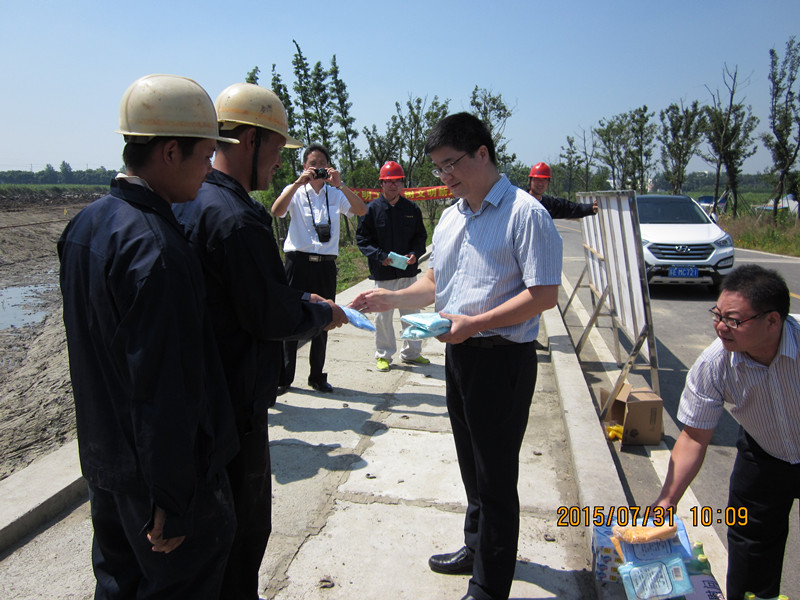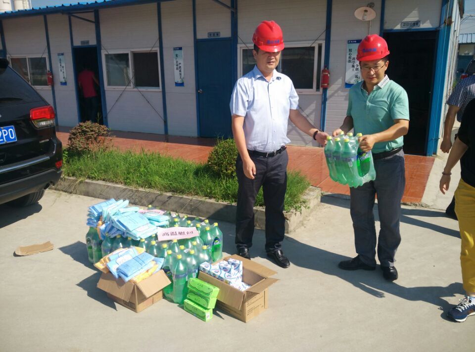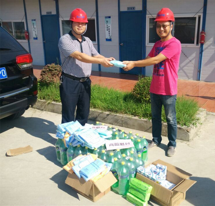 2015年7、8月高溫天連續不斷,超過(guò)十多天連續最高溫度35℃以上,水利局及水建公司一行人員向一線(xiàn)職工贈送防暑降溫用品,保障高溫作業(yè)職工身體健康,督促項目部落實(shí)防暑降溫相關(guān)政策規定,根據夏季高溫特點(diǎn),調整高溫作業(yè)工時(shí),實(shí)施高溫錯時(shí)作業(yè),改善高溫作業(yè)職工勞動(dòng)條件,重點(diǎn)關(guān)注現場(chǎng)施工人員的生產(chǎn)生活環(huán)境。