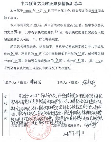 2016年7月9日召開(kāi)支部大會(huì ),全體黨員參加了會(huì )議,本次會(huì )議共有四個(gè)議程:一、按昆山市委組織部昆組通[2016]31號文“關(guān)于組織開(kāi)展2016年“黨章學(xué)習日”活動(dòng)的通知”精神:1、以黨支部為單位組織黨員原原本本學(xué)習黨章,支部書(shū)記上黨課;2、組織全體黨員普遍開(kāi)展一次重溫入黨誓詞活動(dòng)。3、開(kāi)展主題實(shí)踐活動(dòng):至少要開(kāi)展一次黨員志愿服務(wù),在職黨員進(jìn)社區,在職黨員年初已全部進(jìn)社區報到。上月我支部全體在職黨員均自愿參與了“黨員關(guān)受基金”“阜寧振災捐款”的捐款活動(dòng),共計金額為2300元和2500元。二、按水利局黨委昆水黨[2016]7號文《關(guān)于在水利系統黨員中開(kāi)展“學(xué)黨章黨規、學(xué)系列講話(huà),做合格黨員”學(xué)習教育的實(shí)施方案》的通知精神要求,2016年5月30日我支部發(fā)了關(guān)于“兩學(xué)一做學(xué)習教育實(shí)施方案” 的通知,1、要求每名在職黨員要認真學(xué)習文件精神,利用業(yè)余、休息時(shí)間進(jìn)行全面地、系統地學(xué)習黨章、黨規、學(xué)系列講話(huà)、學(xué)習《準則》《條例》,學(xué)習完成后結合自己的實(shí)際工作情況寫(xiě)一篇學(xué)習體會(huì )(可以打印,簽名必須手簽),于6月底前上交支部,年底將評選出幾名優(yōu)秀學(xué)習心得者;2、我支部結合公司的崗位不同的實(shí)際情況不同,設立了三個(gè)“黨員示范崗”:綜合業(yè)務(wù)部、檢測科一室、蘇州高新區水環(huán)境整治六標項目部,希望各位黨員向他們看齊,立足本職、盡心盡責。3、開(kāi)拓創(chuàng )新上黨課,今天優(yōu)秀黨員、年輕黨員兩名(鄧云澤、曾優(yōu))就“兩學(xué)一做”學(xué)習教育心得并聯(lián)系個(gè)人的實(shí)際工作給全體黨員上一次黨課。4、各位黨員在完成以上基本任務(wù)的情況下,還可以將黨員志愿服務(wù)與做合格黨員結合起來(lái),自愿參加一些黨員志愿服務(wù)活動(dòng)上報到支部,將在年底納入黨員考核中。三、討論、票決預備黨員曾優(yōu)轉正事宜