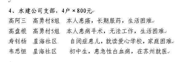 按照市委扶貧幫困工作指示精神,結合水利局與周莊有關(guān)村掛鉤扶貧和富民強村工作指導任務(wù),決定對周莊祁浜村、高勇村及結對幫困社區開(kāi)展春節慰問(wèn)活動(dòng),根據局黨委的安排,我支部于1月17日下午1:30對以下困難戶(hù)進(jìn)行了慰問(wèn)。