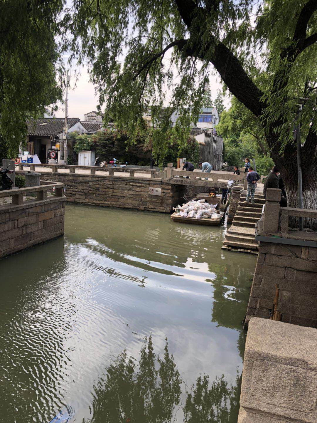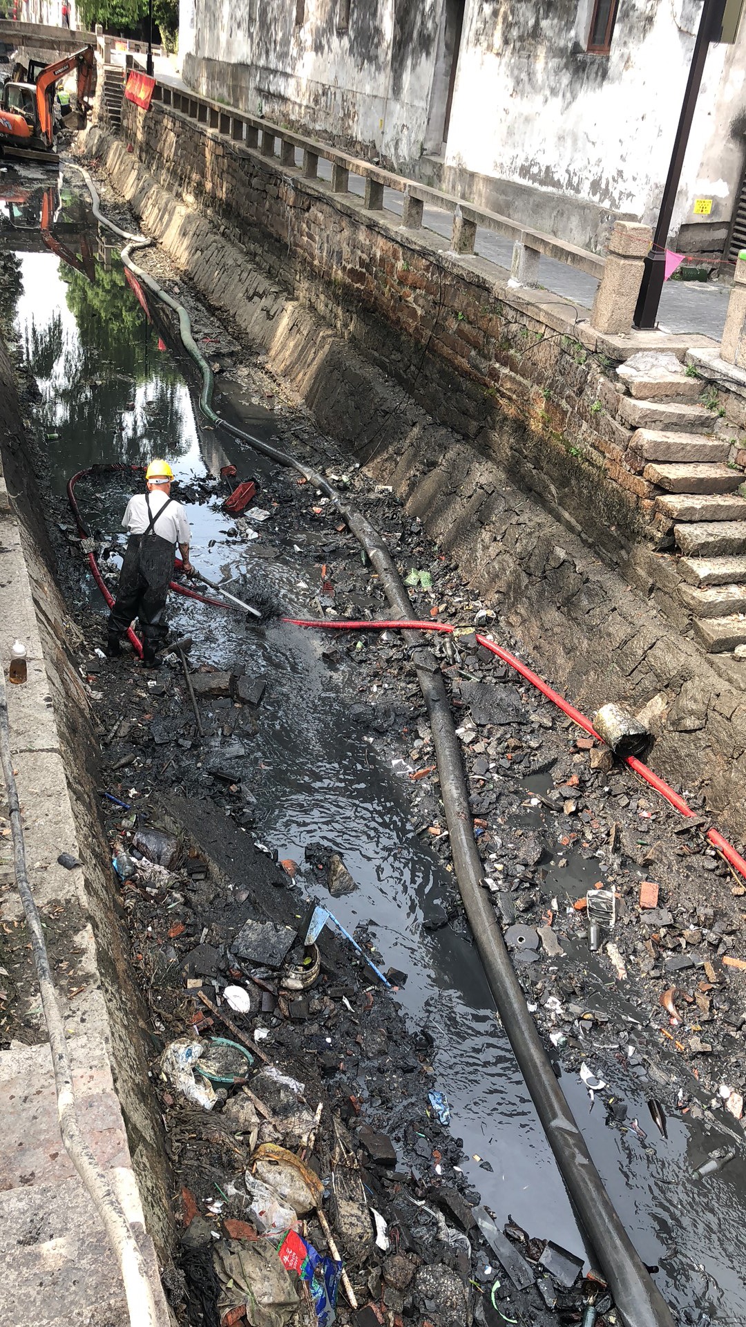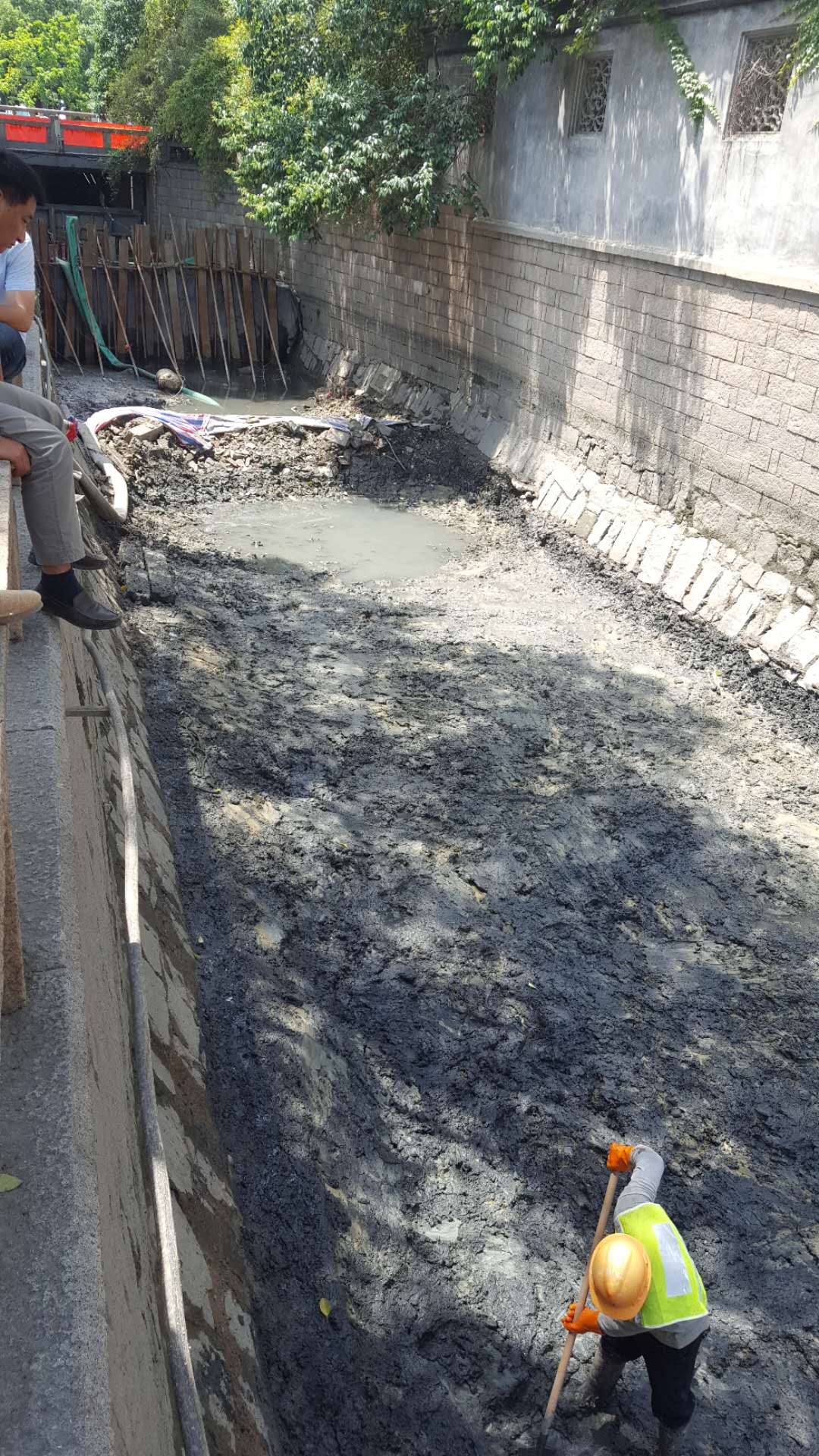 蘇州市河道處的蘇州市應急清淤工程II標,位于姑蘇區平江路側,河道全長(cháng)2.1km,采用干河清淤,自2018年5月5日進(jìn)場(chǎng)以來(lái),目前已通過(guò)人工配合小型機械的施工方法完成大、小圍堰六條,且第一段主河段500m已降水1m以上,圍堰土方由于施工場(chǎng)地、道路的限制,只能通過(guò)人工裝土、裝袋,用商務(wù)車(chē)運輸到小橋上,再用人工拋到船上,再通過(guò)人工來(lái)填筑圍堰,水泥漿計劃通過(guò)接力泵一次性打到運輸船上;河道垃圾也只能通過(guò)人工裝袋上岸,電瓶三輪車(chē)運輸至上船點(diǎn)再棄土。