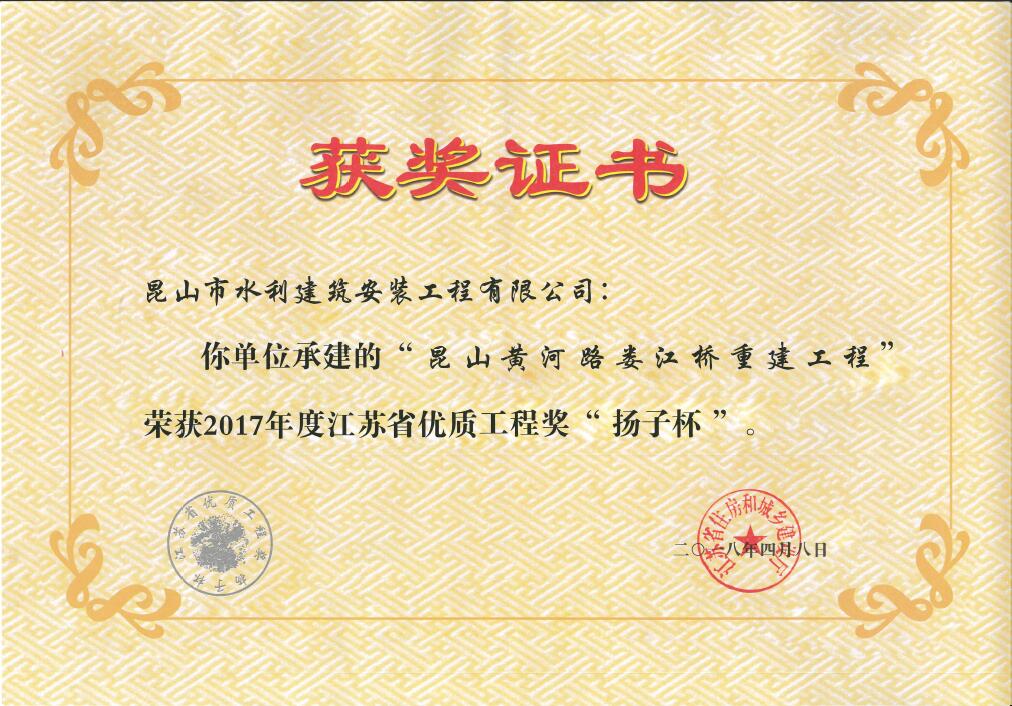 熱烈祝賀黃河路樓江橋重建工程榮獲2017年度江蘇省優(yōu)質(zhì)工程獎“揚子杯”