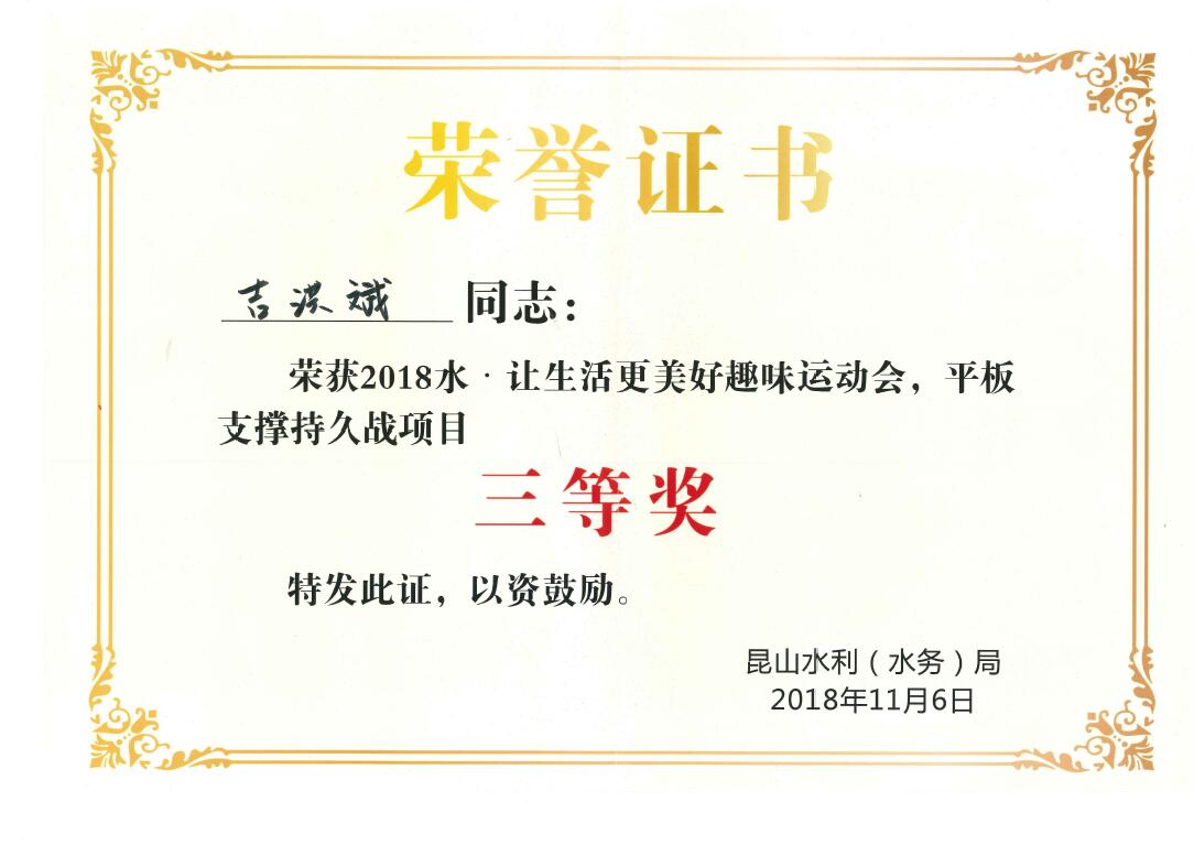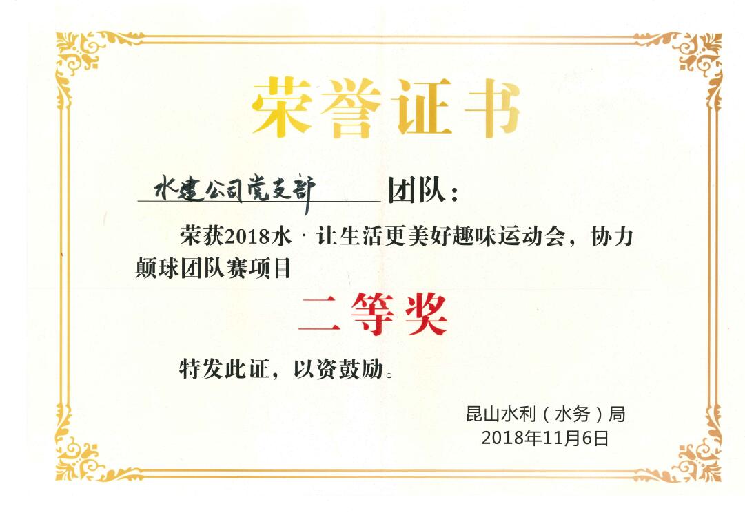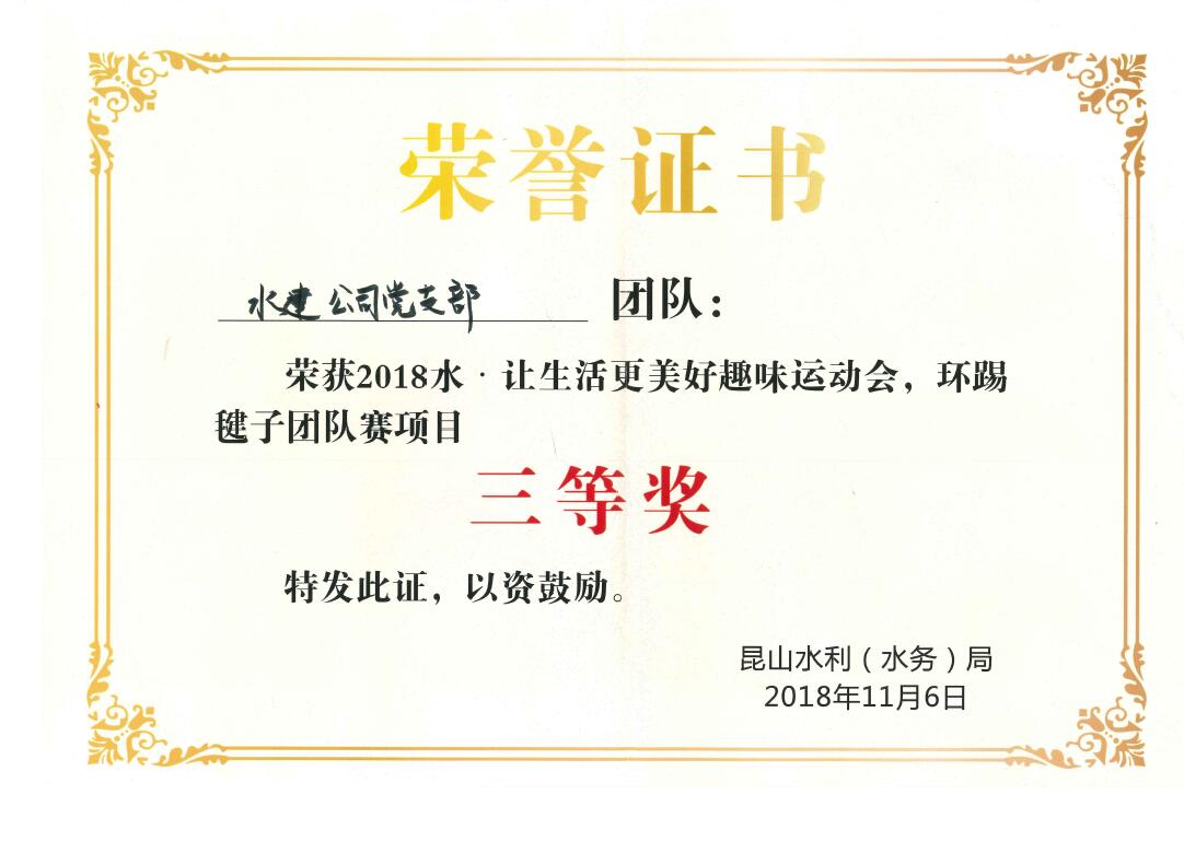 2018年11月06日下午,我公司17名職工參加了由昆山市水利(水務(wù))局主辦的2018水·讓生活更美好趣味運動(dòng)會(huì )。積極參與了環(huán)踢毽子對抗賽、乒乓托球接力賽、平板支撐持久戰等7個(gè)項目。參賽人員放下了工作和生活中的壓力,在輕松愉悅的環(huán)境中,放松了身心,增進(jìn)了團隊之間的默契,取得了不錯的成績(jì)。