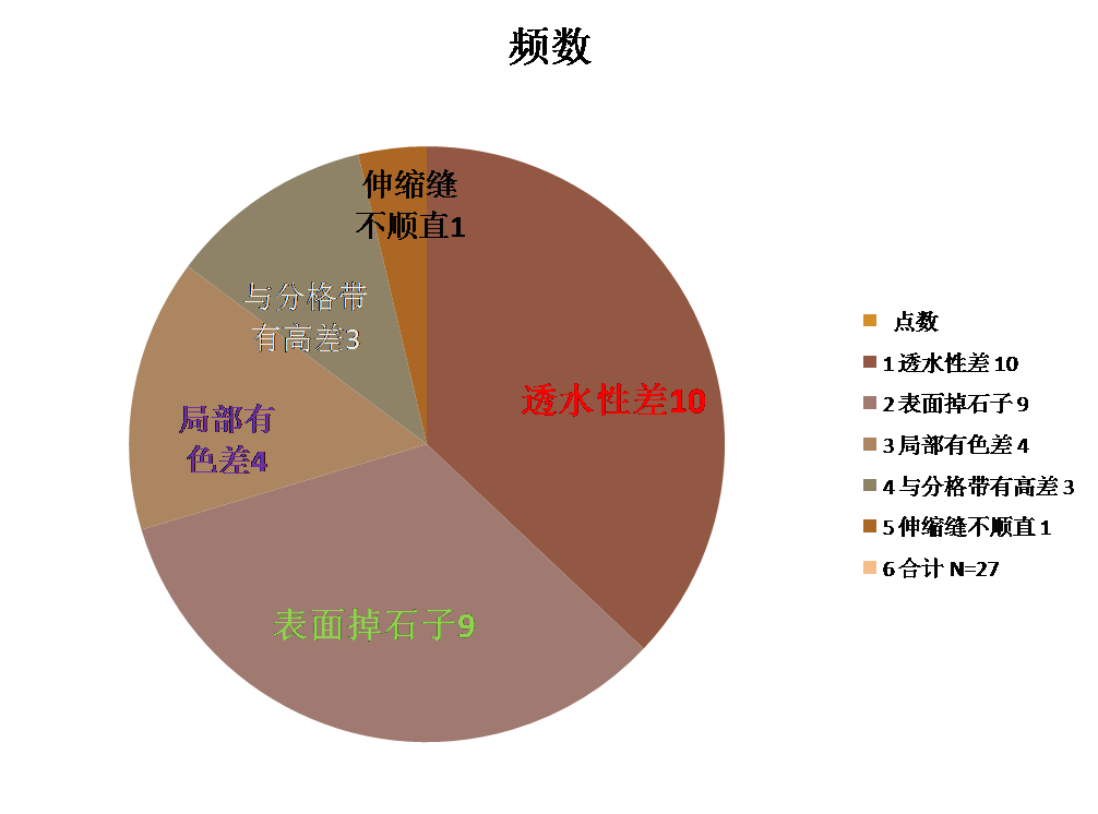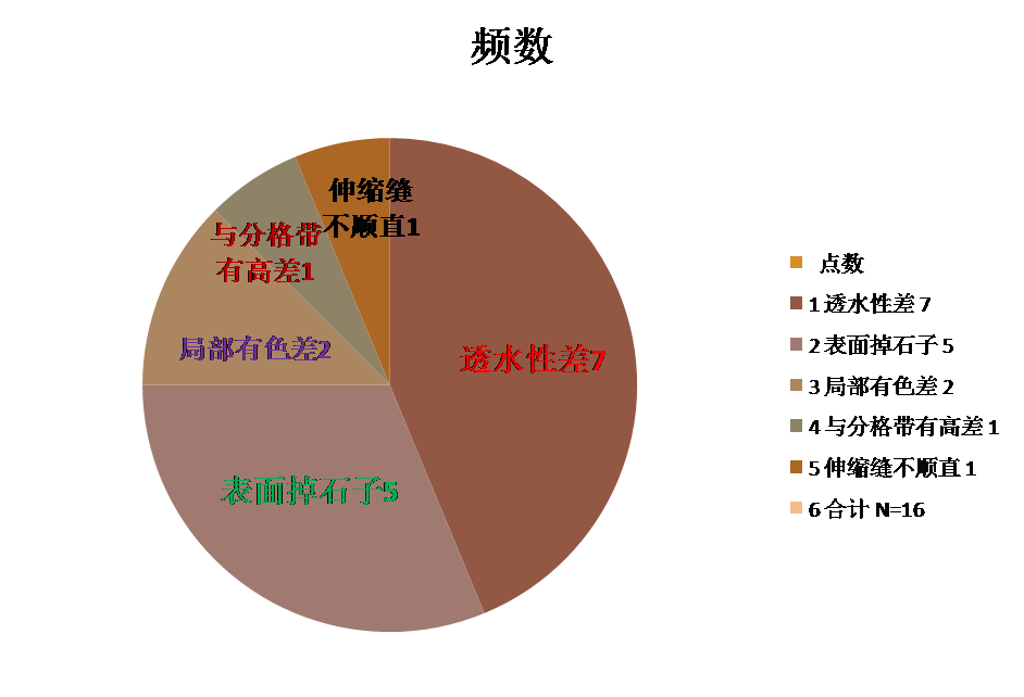 小組應用《帕米孔藝術(shù)路面施工作業(yè)指導書(shū)》進(jìn)行施工,并對鞏固期內2021年2月~3月施工的樁號為24+000~24+675透水混凝土施工的帕米孔藝術(shù)路面的質(zhì)量進(jìn)行抽檢,共采集350點(diǎn),合格點(diǎn)334點(diǎn),合格率95.4%。我們對這些不合格點(diǎn)進(jìn)行了匯總、分析,繪制了統計表如下: